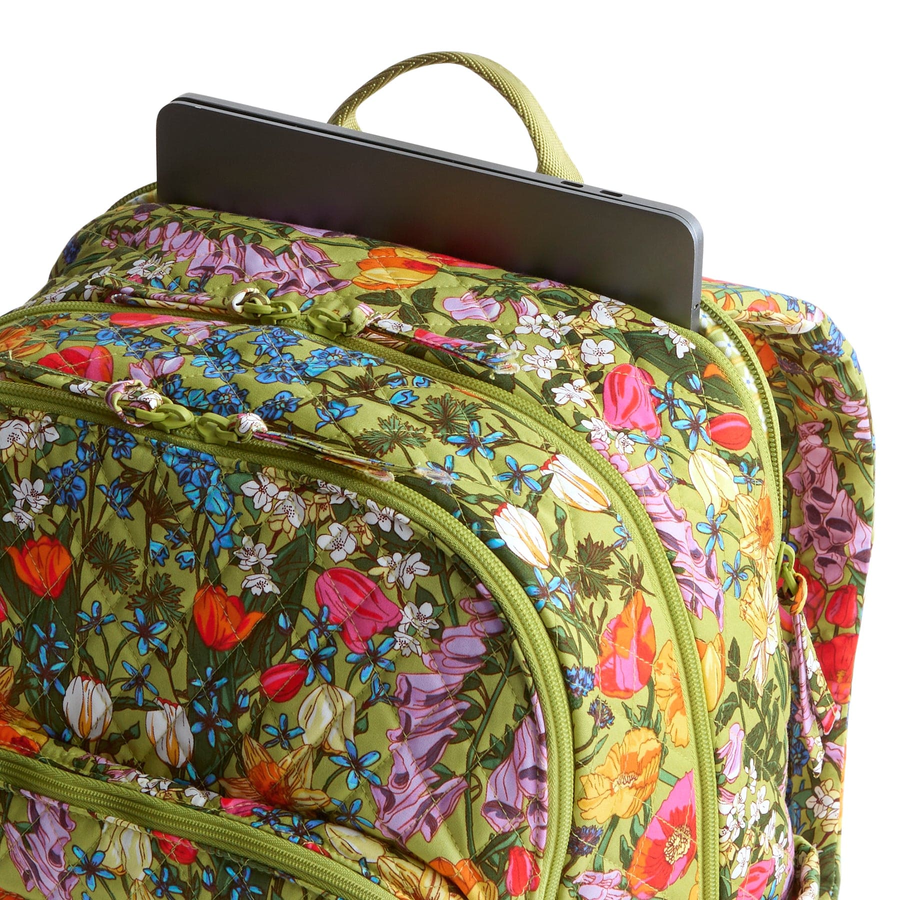 Front compartment features two slip pockets and a zip pocket
